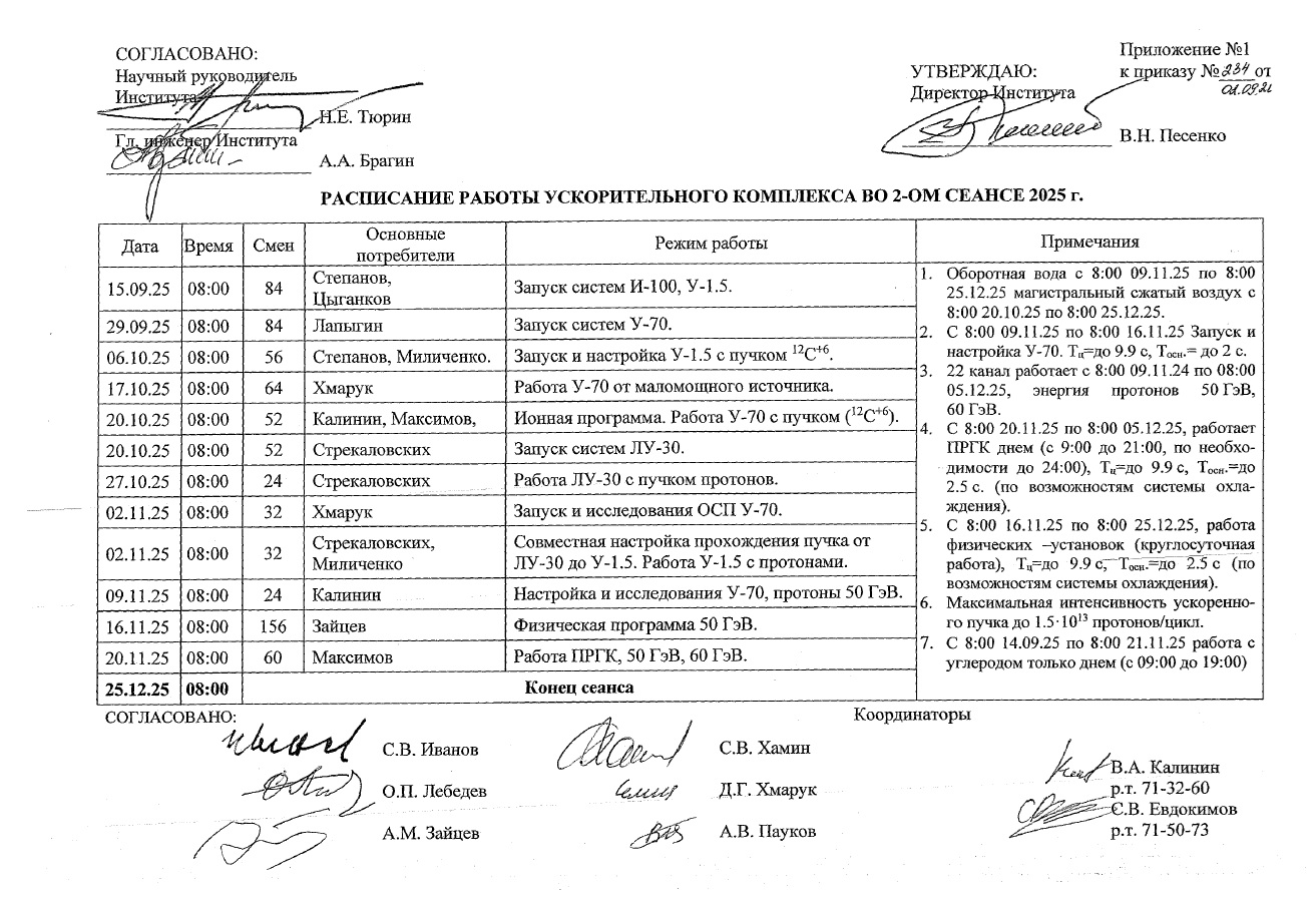 Расписание работы ускорителя в 2-ом сеансе 2025 года